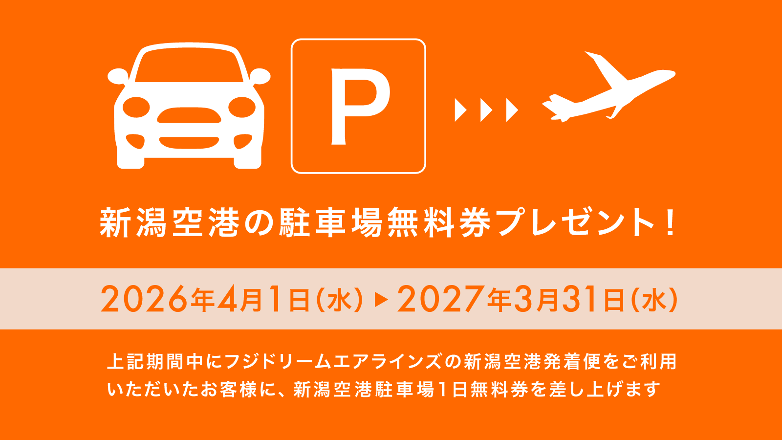 期間 2026年4月1日(水)~2027年3月31日(水)対象期間中にフジドリームエアラインズの新潟空港発着便をご利用いただいたお客さまに、新潟空港駐車場1日無料券を差し上げます。