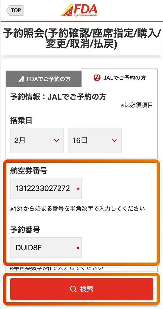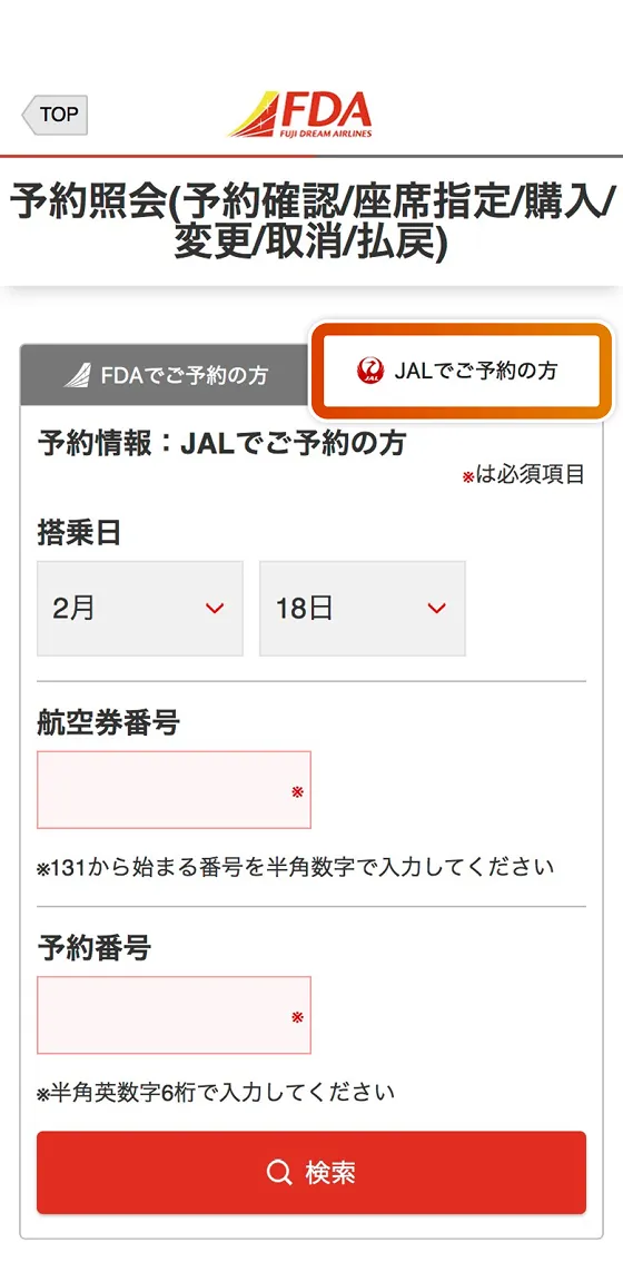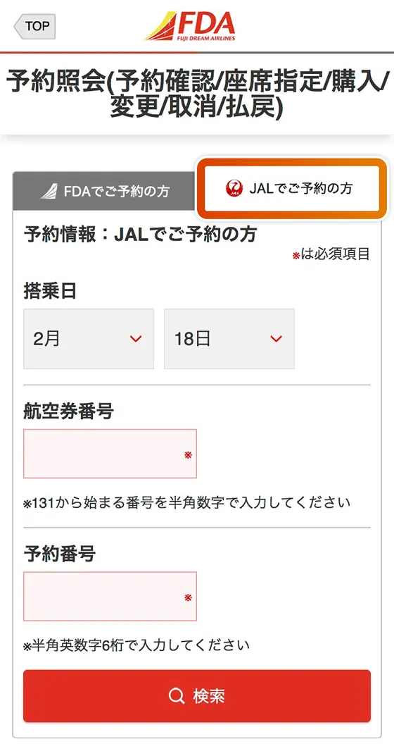 「航空券番号」「予約番号」を入力して、検索をタップしてください。