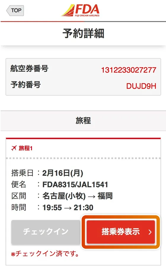 搭乗券を表示する場合は「搭乗券表示」をタップしてください。 -