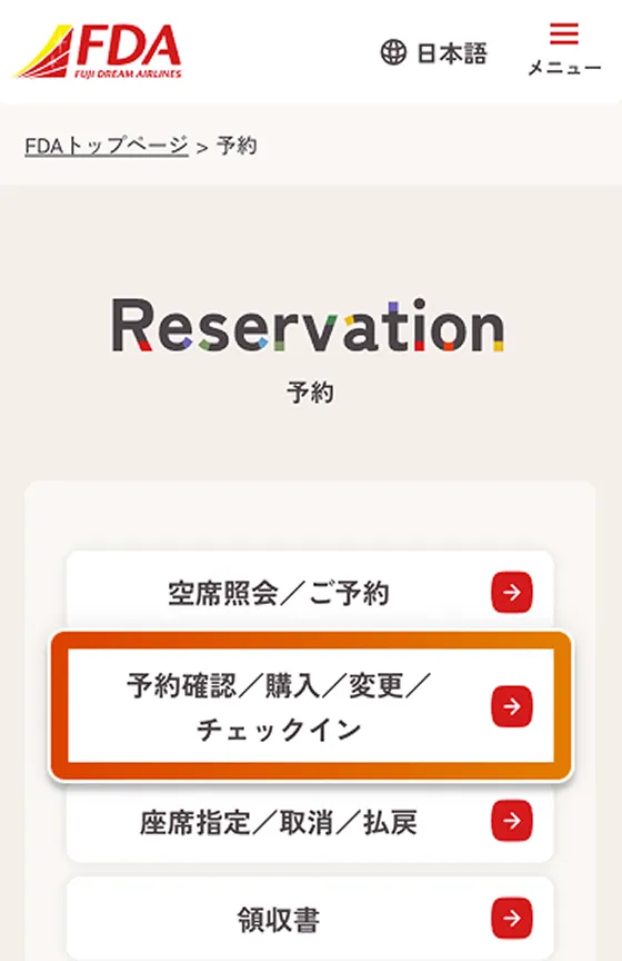 「予約管理」内の「予約/購入/変更/チェックイン」をタップしてください。