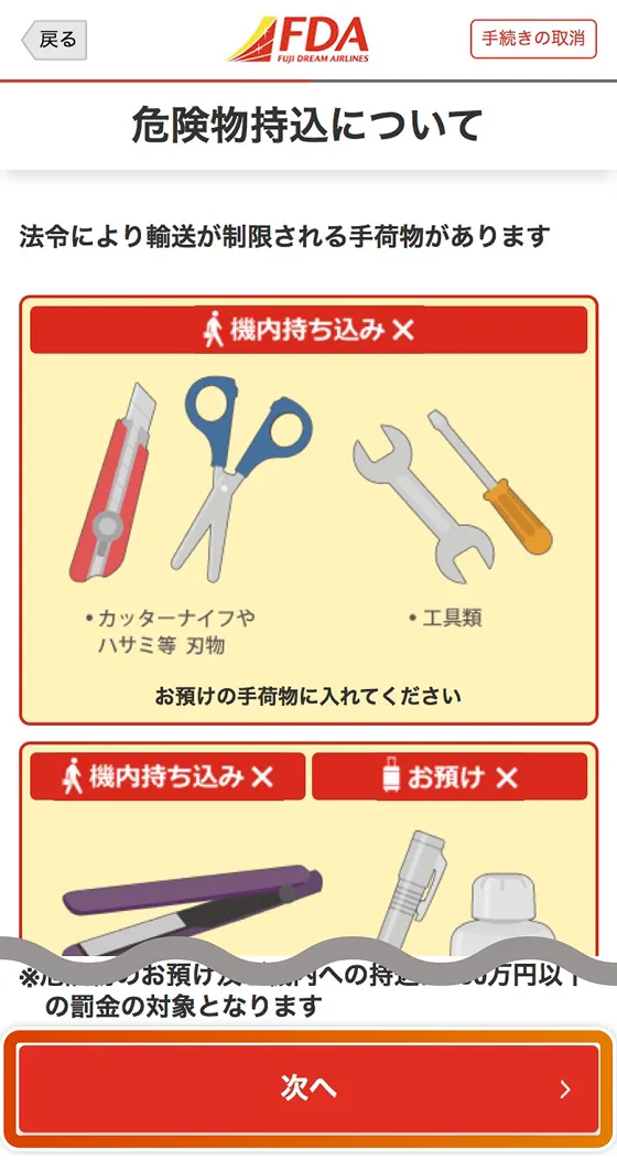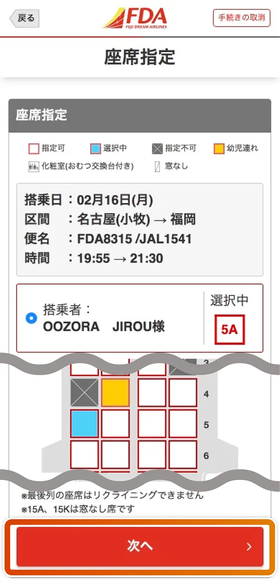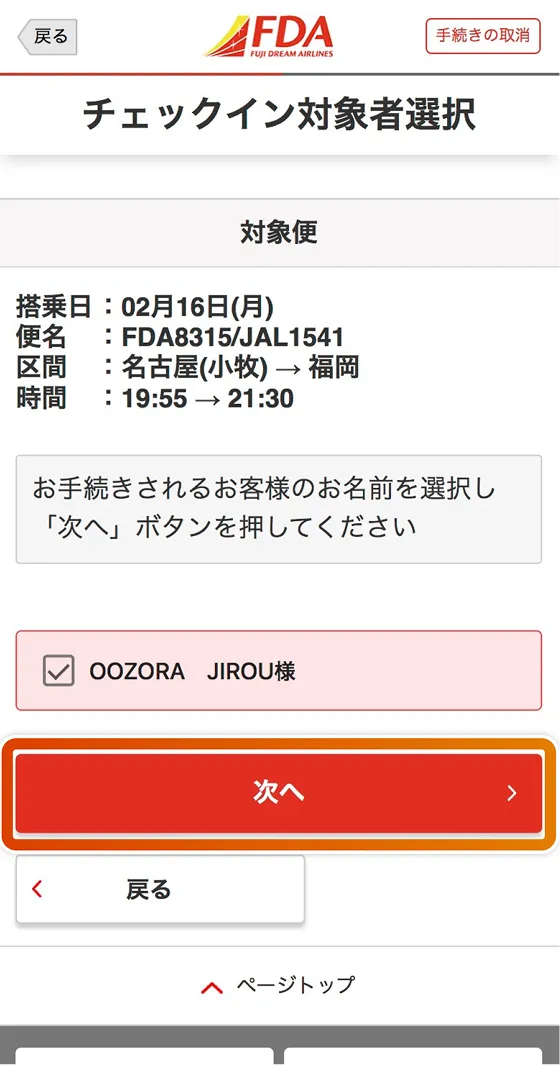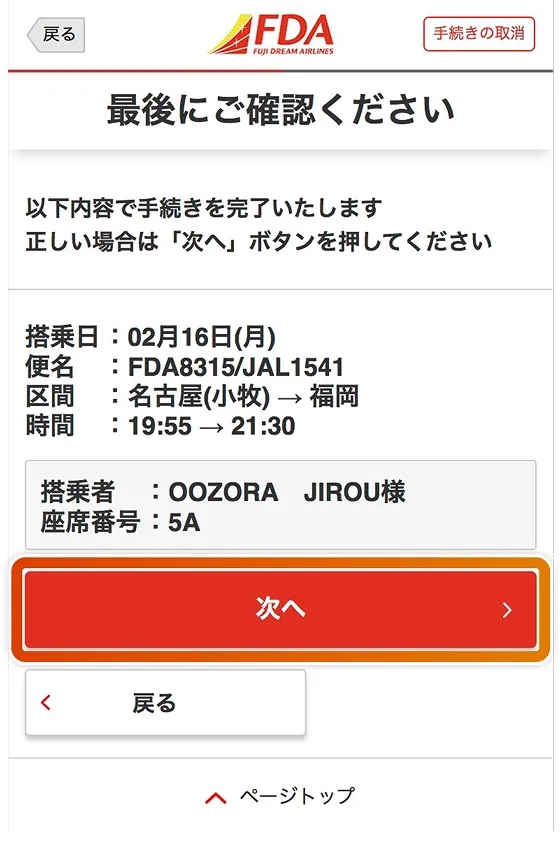 便名・区間・搭乗者・座席番号を再度確認し、間違いがなければ「次へ」をタップしてください。