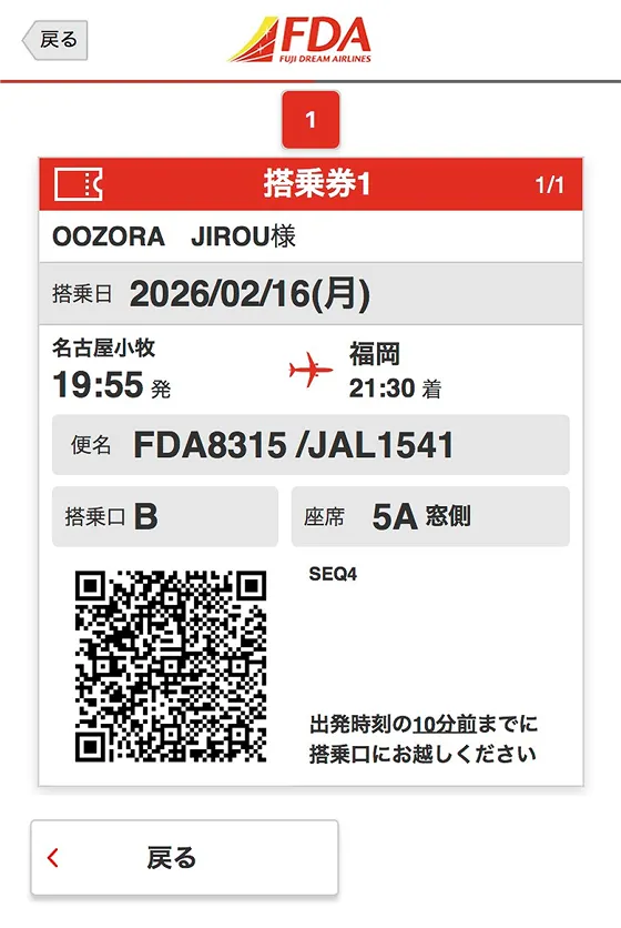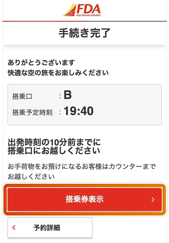 搭乗券が表示されますので保安検査場や搭乗口ではこちらの画面を空港係員へ提示してください。