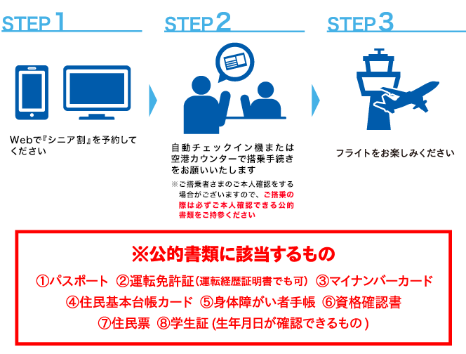 | 利用条件 | 以下の条件を満たしたうえで、予約/販売開始日からご搭乗日前日までに、『シニア割』運賃でご予約/ご購入いただいた場合に適用されます ※Web操作ができない適用年齢に該当するお客様ご本人のみコールセンターまたは空港カウンターでもご予約を承ります ※販売座席数には限りがあり、一部の期間/路線/便によっては設定がない場合があります ■適用年齢に該当するお客様ご本人および同行者5名までご利用いただけます ※対象のお客様お一人でもご利用いただけます ※ご同行者様の追加はご予約時、またはお支払い前に予約照会画面から予約詳細画面にてお願いします ■ご搭乗手続きの際、年齢を証明する公的書類をご提示いただく場合がございます ※公的書類をご提示いただけない場合は、『シニア割』でご搭乗いただけません ■適用年齢に該当するお客様ご本人がご搭乗を取り消した場合、同行者のみではご利用いただけません ■空港でのご搭乗手続きは、自動チェックイン機、もしくはスタッフのいる有人カウンターで承ります |