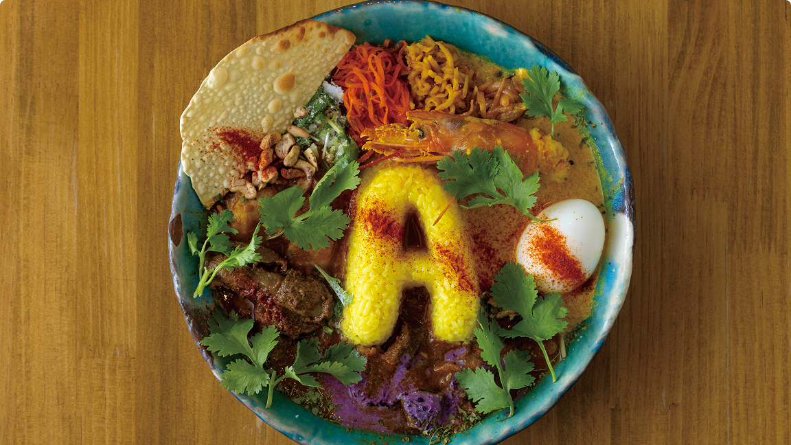 この店のカレーのシンボルは、ANDYのAをかたどった色鮮やかなターメリックライス。2種類以上のカレーをあいがけでオーダーすると、この形状で提供してくれる。ランチタイムには、定番カレー3種と週替わりカレー1種がメニューに並ぶ。なかでも「チ キンカレー」は息の長い定番メ ニュー。アジョワンシードのさわやかさが食欲を刺激して飽きのこない味だ。週替わりカレーは、より挑戦的な素材合わせが楽しい創作カレーで、新作を楽しみにしているファンも多い。