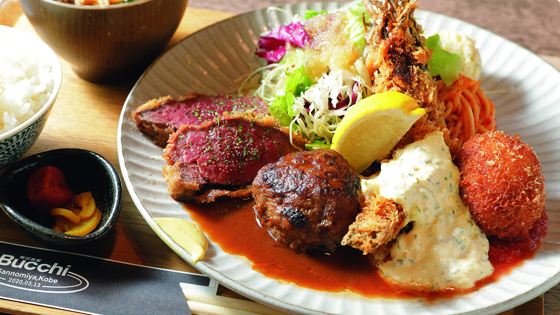 そのなかでもとりわけ目を引く「SP Bucchi定食」には、主役級の一品がずらり。特筆すべきは、ミディアムレアに火を通した牛肉の赤身に食欲をそそられるビフカツ。ジューシーなハンバーグとともに、自家製のデミグラスソースで味わおう。存在感が際立つサイズ感の有頭エビのフライは、ザクッとした衣の歯ごたえと、エビのうまみを刻んだピクルス、ゆで卵、タマネギ入りのタルタルソースをからめていただく。カニクリームコロッケはトマトソースと一緒に。ソースもすべて自家製だ。これらのサイドを固めるのは、ナポリタンスパゲッティ、ポテトサラダ、山盛りになった葉野菜のサラダのほか、ごはん、味噌汁、漬物。しかも、ごはんは大盛り無料だというから、ぜひおなかを空かせて向かいたい。気になるメニューがいっぱいで、何度も訪れたくなる店だ。