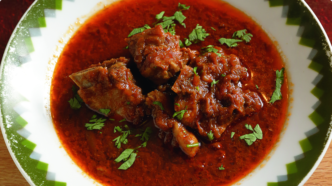 定番メニューは、「マトンカレー」と「チキンカレー」。トマトやタマネギなどの野菜をベースに、さまざまなホールスパイスを組み合わせた、穏やかでやさしい香りが特徴だ。柔らかくなるまで煮込んだ骨 付き肉は、ぜひ手を使ってそのうまみをじっくりと味わいたい。別添えのライスは、細長くパラパラとしたバスマティライス。日替わりのサブジ (野菜のおかず)とムング豆のサラダが添えられる。