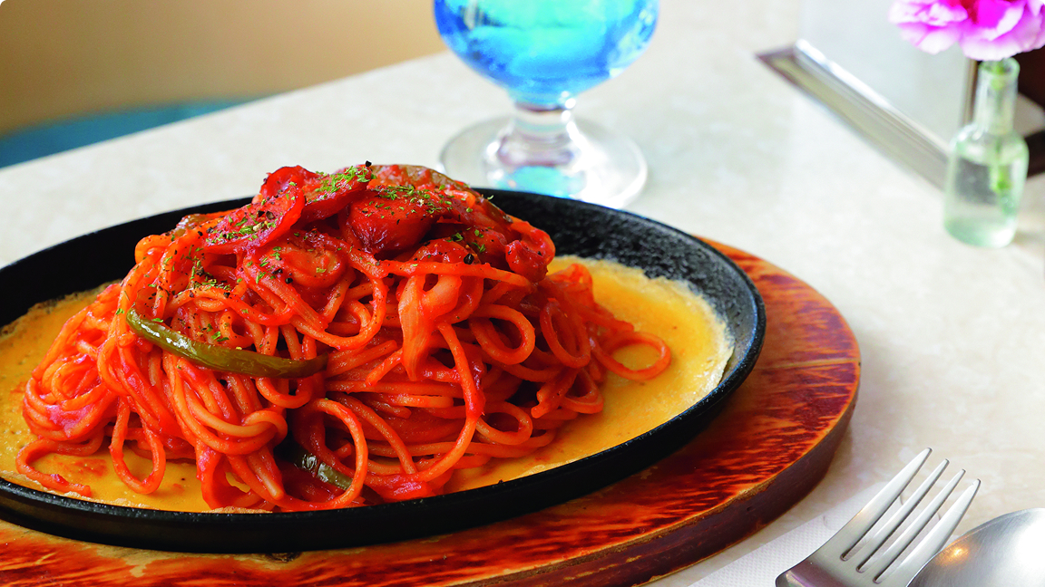 鉄板で供される熱々のナポリタンは、太めの麺に濃厚なソースがしっかりと絡む。ケチャップを加えたオリジナルのトマトソースは、タイミングを2回に分けて加えた深みのある味わい。鉄板で薄焼きにした卵と一緒に口に運ぶと、その自然な甘味が抜群 のバランスだ。お腹を満たした後は、澄んだブルーが目に涼やかな「セリナクリームソーダ」を。はす向かいに ある焙煎所「コバルト」の豆を使うコーヒーでほっとひと息つくのもおすすめだ。