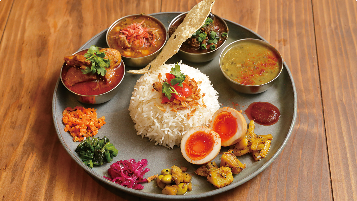 毎日変わるメニューは、南 インドやスリランカのスパイス使いをベースにしながら、積極的に自己流のアレンジを施す。食材の仕入れは、自転車で駆け回り、自ら目利き。国産の食材をベースに、なるべく神戸や淡路島などの近郊のものや無農薬のものを調達するのがこだわりだ。実験的な組み合わせにもチャレンジし、味はもちろん食べ手が楽しめ るようにと意識する。味わうスタイルは「好きなようにどうぞ」と食べ手に委ねる。