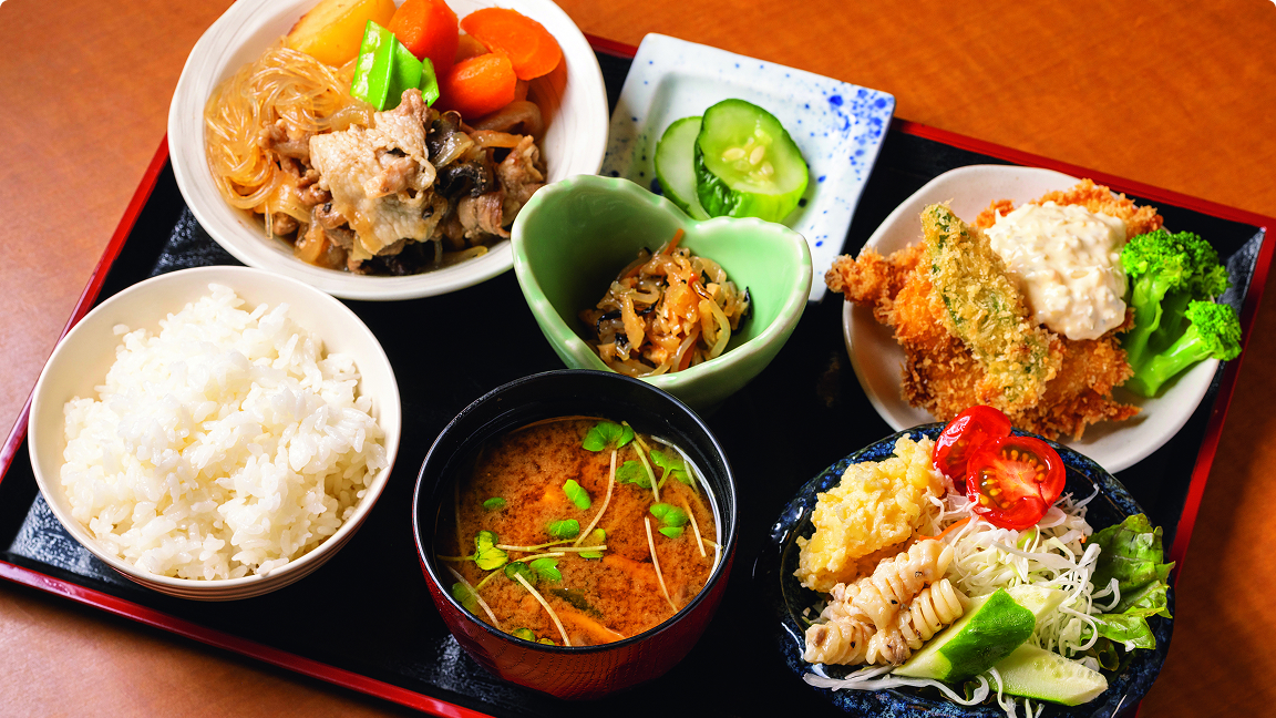 料理は全般的に上品な味付けで、「肉と魚、野菜をバラ ンスよくしっかり食べてほしい」との思いが込められている。小鉢を含め、定食の献立が毎日異なるのも、この道48年の木下さんのキャリアがあってこそだろう。
