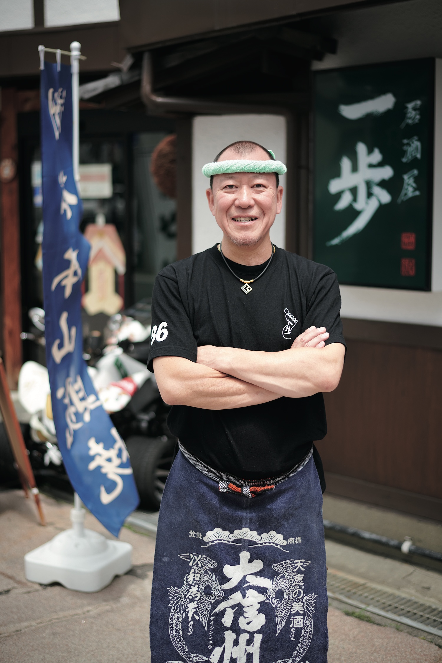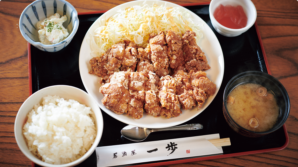 松本城近くの『居酒屋 一歩』は今年開店20周年を迎える山賊焼が人気の店。山賊焼は夜のメニューでも楽しめるが、昼の定食もおすすめ。まずはそのボリュームに驚かされるが、外はサクサク、中はジューシーで、ショウガたっぷりの味噌ベースタレの味付けにごはんが進む。店主の志賀さんは、市内約100店の飲食店やスーパーなどが加盟し、山賊焼のPRを行う「松本山賊焼応援団」の団長も務める方。山賊焼への愛情は人一倍 だ。「松本ではさまざまな味の山賊焼が楽しめますが、当店の山賊焼はボリュームもうまみもたっぷりでニンニクは控えめ。昼間食べても安心!」と志賀さん。応援団加盟店にはのぼり旗も立っているので、旗を目印に訪ねてみよう!