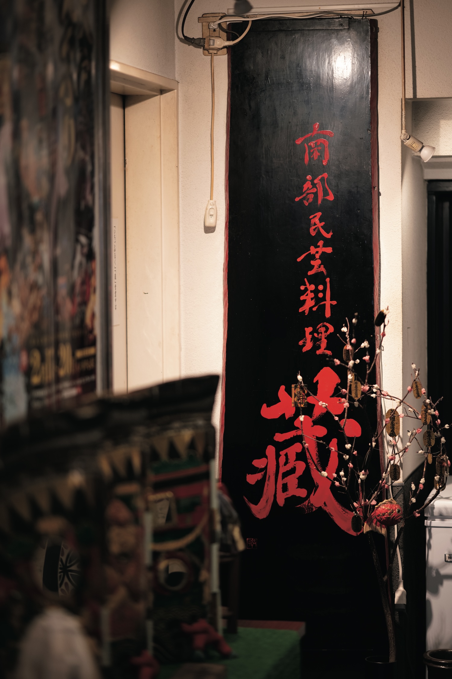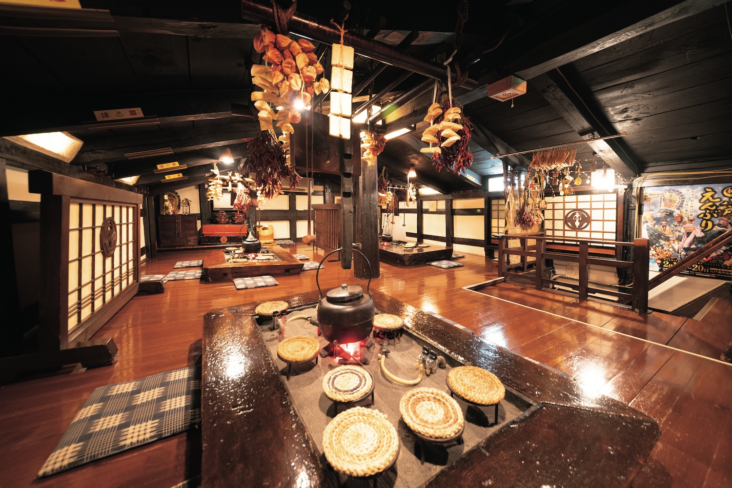 ビルの入口からは想像できないが、奥には、築400年の蔵がそのまま残されていて、お店になっている。窓のない2階建ての店内には、囲炉裏のテーブルや年代ものの箪笥や棚、干し野菜やわら飾り、鉄瓶などがあって、ほの暗く雰囲気抜群。『南部俵積 み唄』や『南部牛追い唄』といった地元の民謡をBGMに、タイムスリップしたようなテーマパーク気分を楽しむことができる。