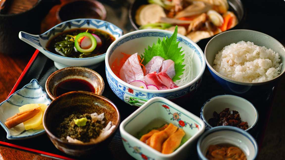 肝心の料理も、新鮮な魚介類はもちろん、旬のキノコや山菜といった、海と山に恵まれたこの地ならではの食材尽くし。今回ご 紹介する「蔵定食」は、ごはんとせんべい汁、刺身、じぶし、メカブ、南蛮味噌、塩辛は共通で、季節の一品のお皿には、八戸らしい旬のものが並ぶ。