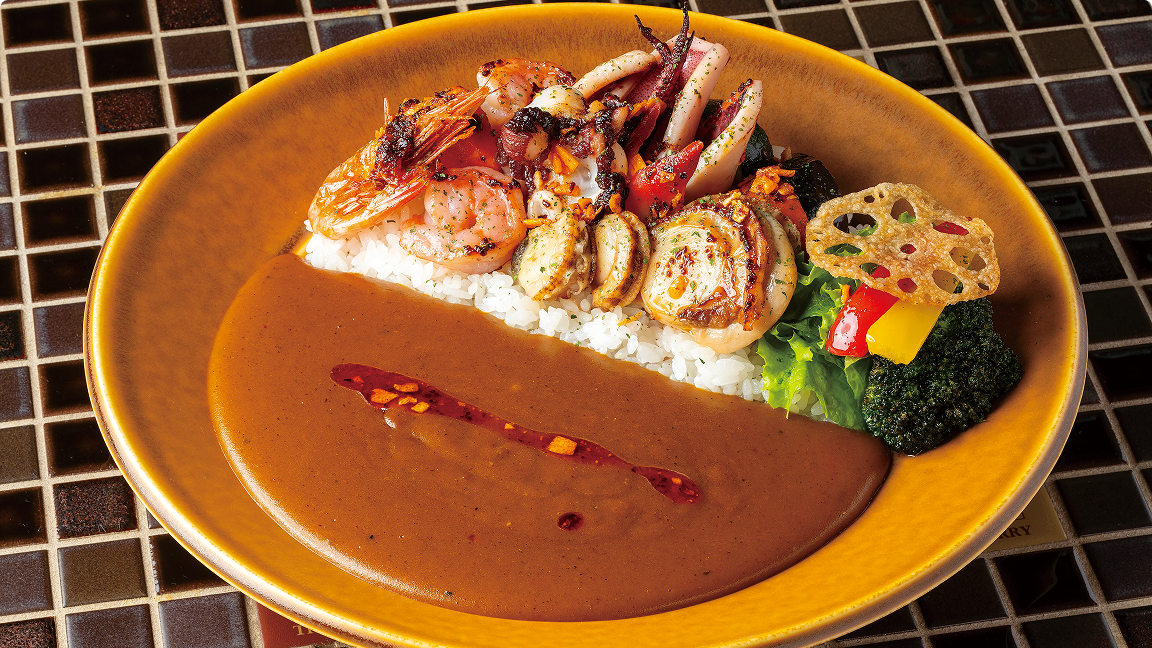 看板メニューの「浜カレー」 は、注文が入ってからソテーするイカやエビ、ホタテなどの海の幸に、彩りゆたかな野菜を添えた一皿。最初はまろやかな印象だが、食べ進めるほどに味わいが深まり、その余韻に引き込まれるのは、やはり甘エビ出汁のなせる業だ。