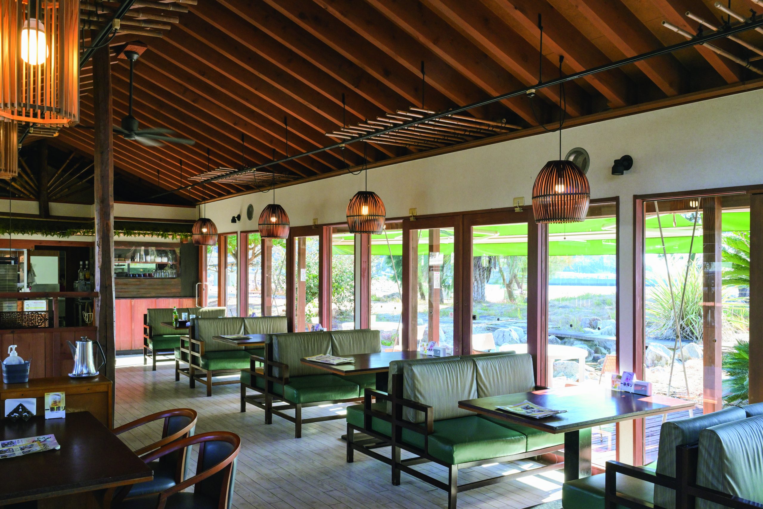 窓から海やヤシの木が見える開放的な店内は、木を生かしたインテリアと天井で静かに回るファンが、アジアンリゾートの心地よさを感じさせる。この季節は、海水浴はもちろん、SUPやボードウォークなどアクティビティも楽しめるので、海で遊んだ後、 食事をするのもいい。テラス席は水着のまま利用できる。