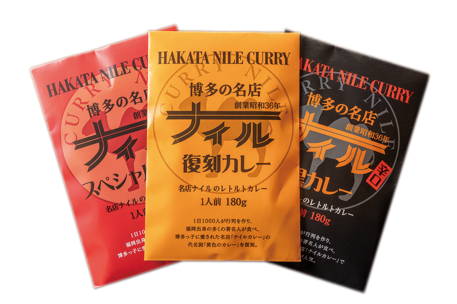 福岡の伝説的なカレーショ ップ『ナイル』が誕生したのは、1961(昭和36)年。福岡随一のターミナル駅・西鉄 福岡駅の飲食店街「西鉄名店街」にあり、当時はモダンな洋食だったカレーライスは爆発的な人気を呼んで一日1000人以上が行列をつくったという逸話が残されている。看板メニューの「ナイル カレー」は、金色に輝くナイル川をイメージしたという黄色いルーがかかったポークカレーで、昭和生まれにとってはまさに“ソウル フード”といえる昔懐かしい味だった。JR博多駅など市内に数店舗の支店があったが、2009年に惜しまれつつ閉店。二度と口にすることができないかと思われていたが、福岡市内で居酒屋などを展開する『益正グループ』が工房ごと継承してそのレシピを忠実に再現し、「ナイル復刻カレー」として再び世の中に送り出した。