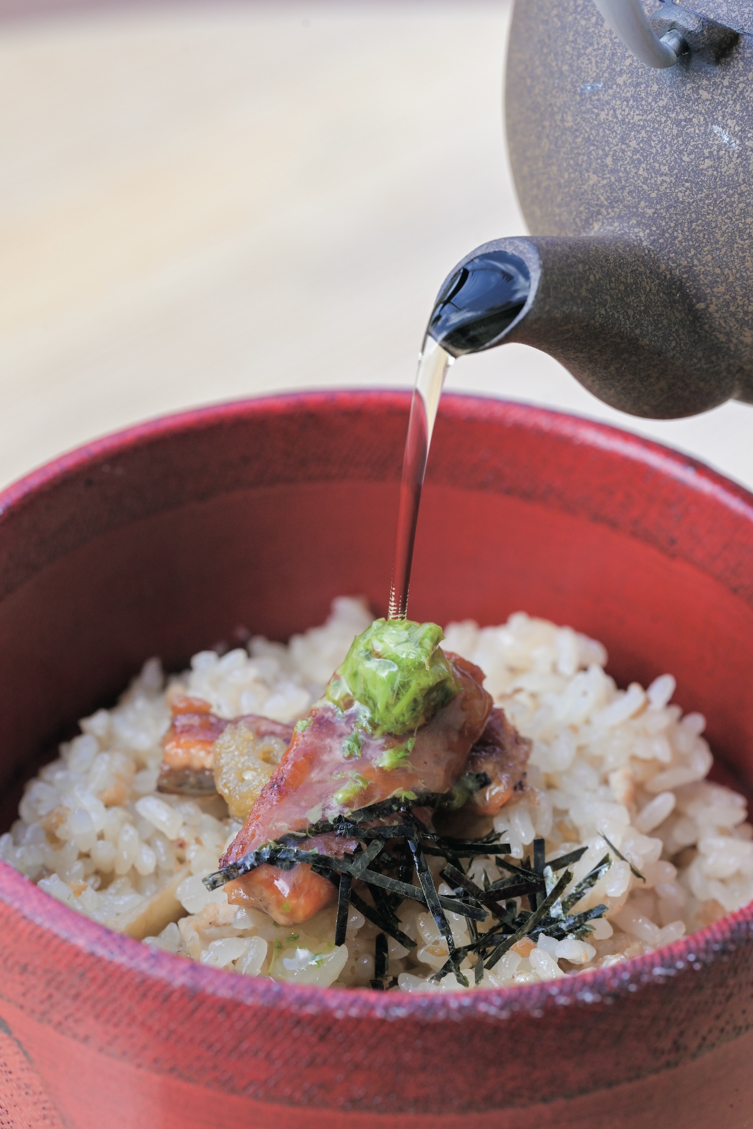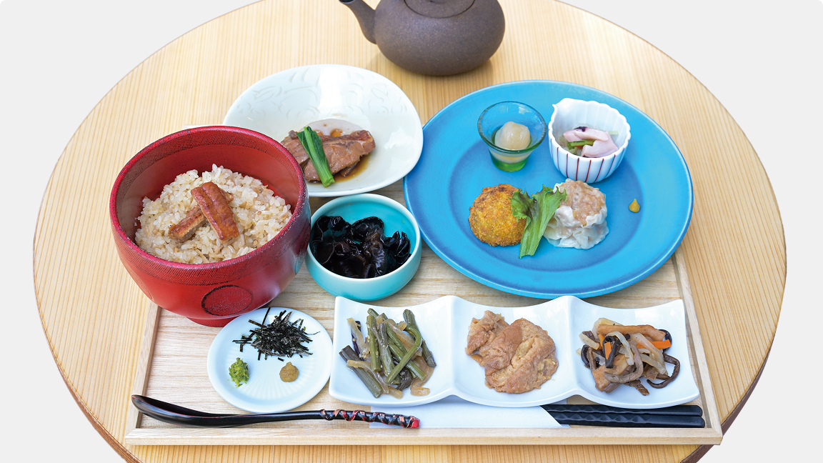 一番人気は滝の湯のお惣菜ランチ。ゼンマイの煮物、車麩の揚げ煮など、さすが山形!な惣菜もあれば、滝の湯オリジナルのジャンボしゅうまいや豚の角煮など食べごたえあるおかずも。全8品を雪若丸という地元の白ご飯でいただくのもいいが、鰻のむきそば茶漬けという選択も。添えられた出汁は香り高く上品で、これだけで飲みたくなってしまうぐらいだ。