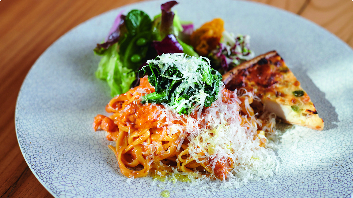 料理はフレンチをベースに、洋食をアレンジした創作料理が中心で、地元信州の旬の食材を生かしたメニューが揃う。「オマール海老クリームソースの生パスタと信州福味鶏のキッシュとサラダのプレート」は、オマール海老の出汁で作った濃厚ソースの生パスタにチーズがたっぷり。キッシュとサラダも加わって程よいボリューム、彩りも鮮やかだ。「信州米豚の自家製ハムサンドイッチサラダ添え」は、玄米を飼料に育った長野県産米豚の自家製ハムを特製タルタルソースとBBQソースで味付けしたサン ドイッチ。パリパリのパンとやわらかなハムの食感が美味さを引き立てる。「季節のクレーム・ブリュレ」などのデザートやドリンク類のカフェメニューも充実。「地元の素材にこだわって、季節ごとにメニューも変えています。美術館目的の方も、観光目的の方も、地元の方も、みなさんに何度でも来ていただける店でありたいですね」と店長の青柳さん。天気のよい日は中庭に面したテラス席もおすすめだ。