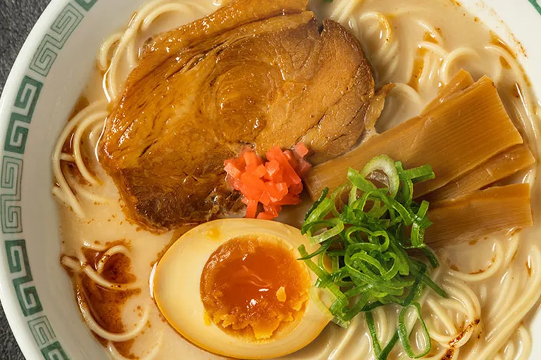 福岡NO.1のご当地グルメと言えば「とんこつラーメン」! 白濁とした豚骨スープに、ストレートの極細麺を絡ませて食べるのが特徴です。濃厚なこってり系や食べやすいマイルド系など、本場だからこその試行錯誤を重ねた個性光る店が市内のいたるところに。お気に入りの一杯を探しましょう。