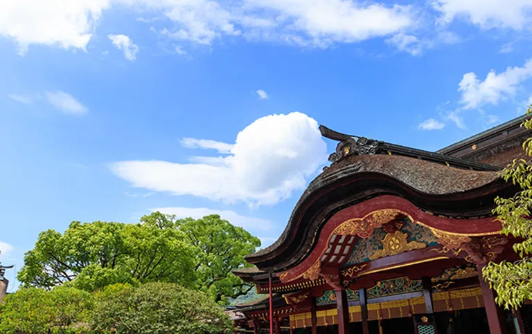 かの有名な神様・菅原道真を祀る「太宰府天満宮」は福岡県随一の歴史を物語る名所で、数多くの参拝者が絶えず訪れます。参道まで続く門前には80軒を超える甘味処やみやげ店があり、歩くだけでワクワクがいっぱいに。なかでも「梅ヶ枝餅」はここだけの名物なのでお見逃しなく。