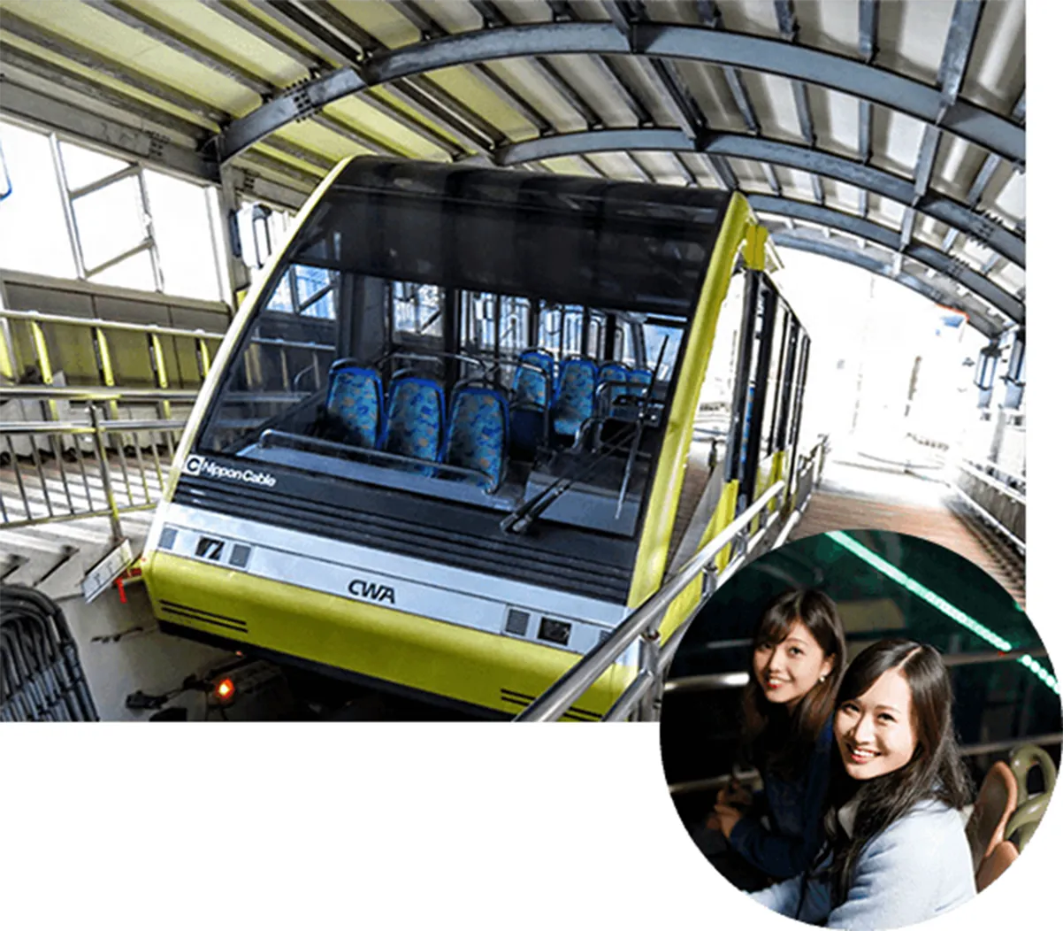 次は、日本新三大夜景に選ばれた『皿倉山(さらくらやま)』へ。山麓駅からケーブルカーとスロープカー を乗り継いで山頂へ向かいます。乗り込んだ平行四辺形のケーブルカーは、ジャンプ台なみの最大斜度28度を登っていきます。後半はスロープカーに乗り換えて、山頂展望台駅に向かいます。