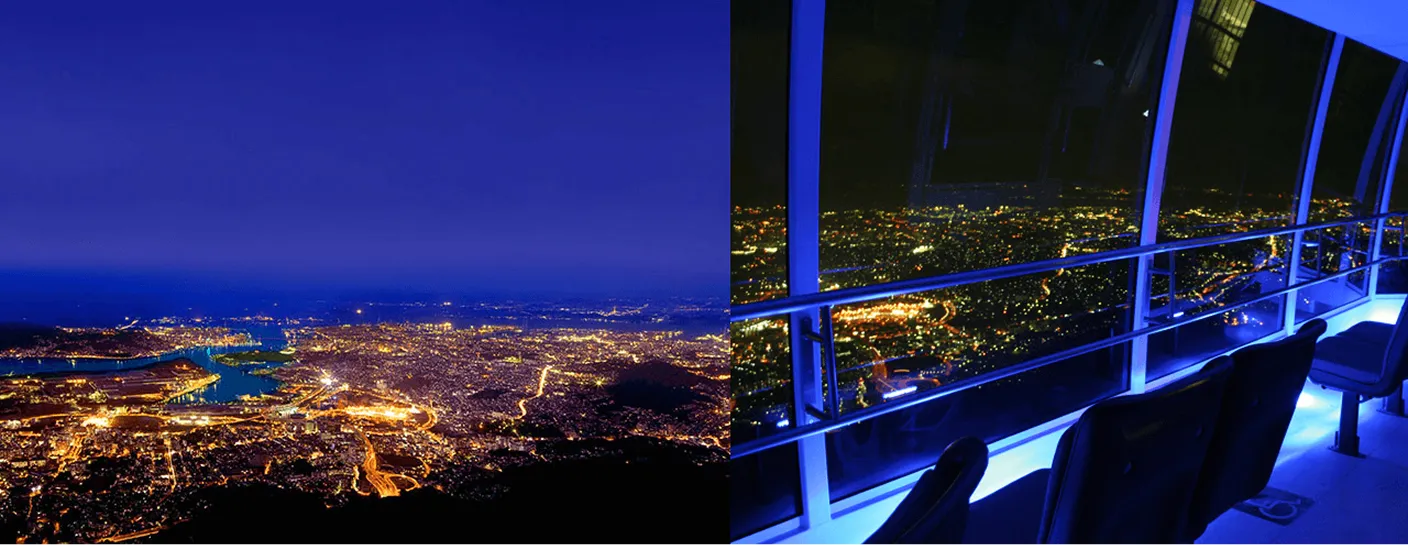 スロープカーの座席は窓側に向いていて、宝石箱からあふれ出たかのような夜景の大パノラマが目に飛び込んできます。圧倒的なスケールでまばゆい光を放つ幻想的な夜景。手前には北九州の工場夜景、小倉エリアから関門海峡、門司港周辺へと光のまばたきが広がります。 また、スロープカーのデッキの蓄光石の中に、ハート型の石を見つけるといいことがあるかもしれません。山頂からの夜景が”恋人の聖地”として認定されたことを記念して造られた「天空ドーム」など、北九州で最も人気の高いロマンチックなデートスポットです。