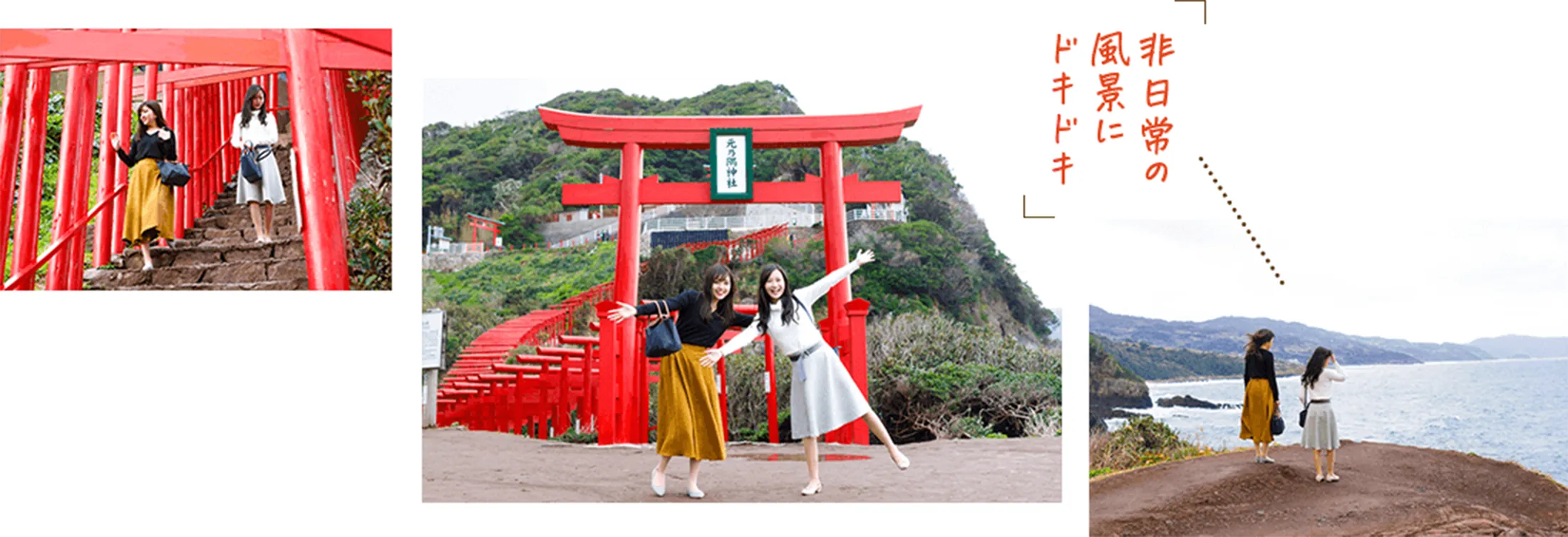 海の岩壁に向かって続く123本の朱塗りの鳥居は美しくも不思議な風景。くぐり抜けた先は広場になっていて、ここから見上げる鳥居もおすすめの撮影ポイントです。
