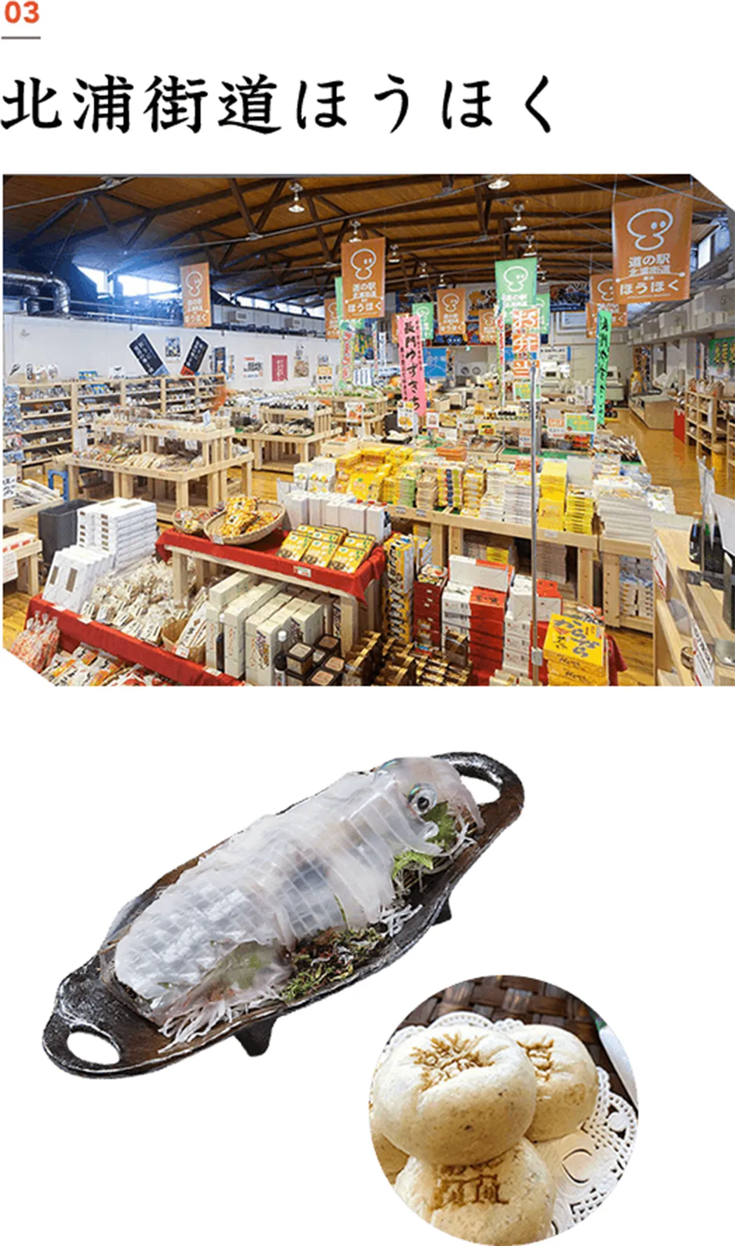 人気の『二見饅頭』は一口サイズで素朴な味。一つ食べ終えると、また一つと食べたくなる美味しさです。ふぐの一夜干しなど下関の海のお土産も、ここで買い求めることができます。レストラン『わくわく亭』では、とれたての旬の魚がのった海鮮丼がおすすめ。シーズン限定の『剣先イカの活き造り』も絶品です。