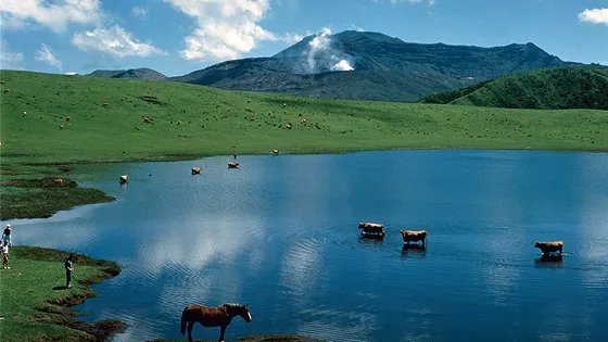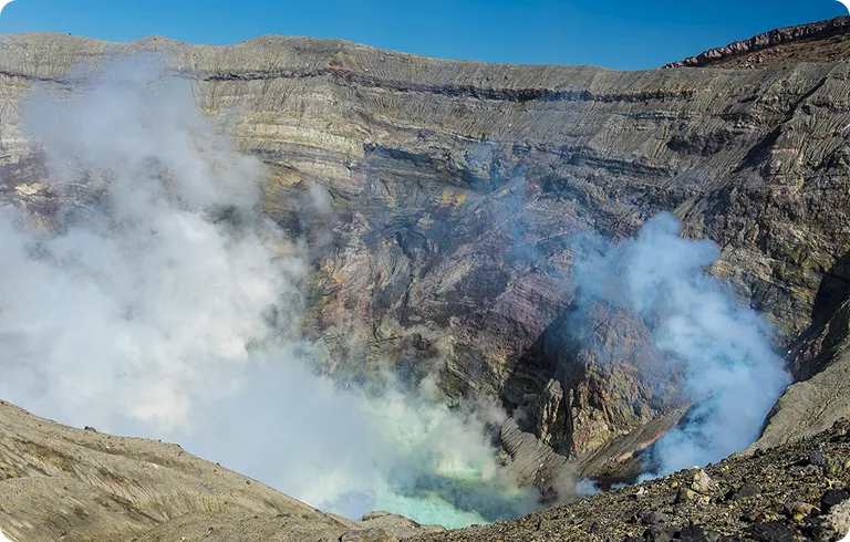 地球が誕生したかのようなダイナミックさを感じさせてくれる火山。阿蘇山は現在も活動を続けていて、白い噴煙を上げる噴火口(周囲4km)を間近で見学することができます。猛々しい無骨な溶岩が広がる火口に、エメラルドグリーンの湯だまりが湧き出る光景は神秘そのものと大興奮間違いなし。