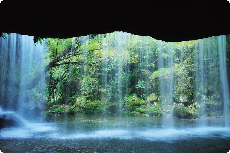 落差約10m・幅約20mの「鍋ヶ滝」は、別名「裏見の滝」と呼ばれています。その理由は、滝の裏側に自然にできた空間があり、滝を真裏から眺めることができるから。その空間を作ったのは約9万年前の阿蘇の巨大噴火です。火砕流が流れ込むことで生み出された自然の造形美を、たっぷり全身で感じてみてください。