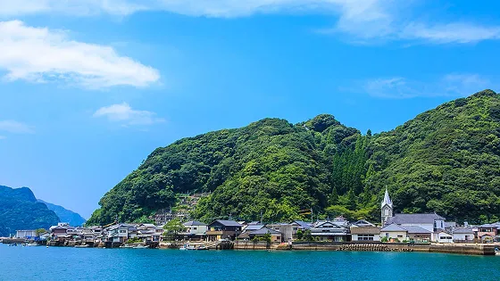 天草下島の小さな漁村にある「﨑津教会」。ここは2018年7月に「長崎と天草地方の潜伏キリシタン関連遺産」として世界遺産に登録された名所です。重厚なゴシック様式の造りの教会は、尖塔の上に十字架が掲げられていて「海の天主堂」とも呼ばれています。漁村の家屋が立ち並ぶ中突如現れる教会は、不思議な郷愁を感じさせてくれます。