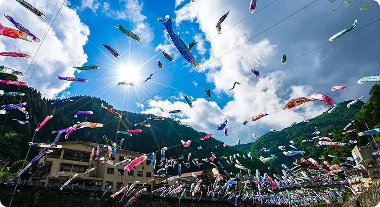 「杖立温泉」は別名・九州の奥座敷と呼ばれる湯治の街。あちこちから湯けむりが上がる昭和レトロな町並みは、まるでタイムスリップしたかのような気分にさせてくれます。なかでも4月1日〜5月6日に毎年行われる「鯉のぼり祭り」は感動もの。何百もの鯉のぼりが風になびく様子を見ながら、のんびり名湯を堪能してください。