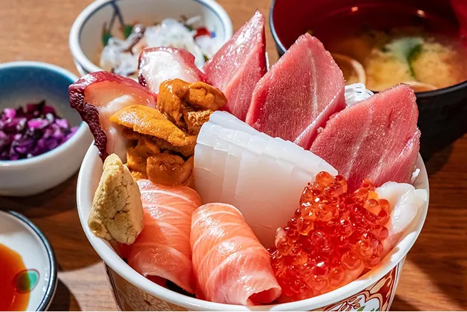 長崎市と言えば鮮度の髙い海鮮は見逃せない。年間10万人が訪れるという「海鮮市場長崎港」で「海鮮丼(2,013円)」を召し上がれ。繁忙期には行列ができることもあるのでお早めに。