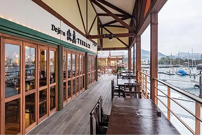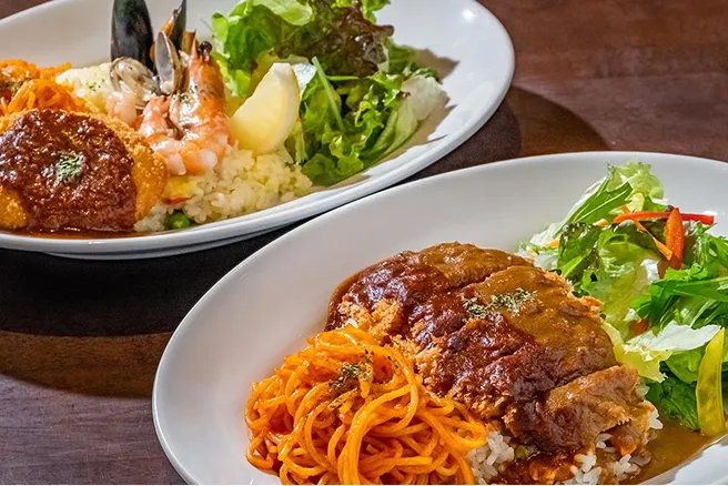 シーサイドで心地よく過ごせる「出島テラス」。長崎といえば一度は食べたいご当地グルメ「トルコライス(1,540円)」や、オリジナルの人気メニュー「出島ライス(1,650円)」をご賞味あれ。