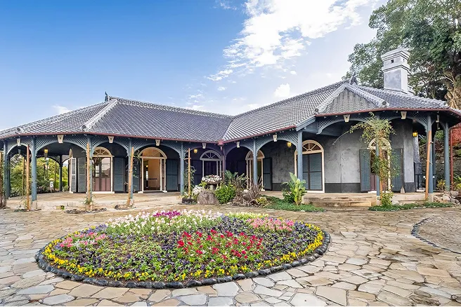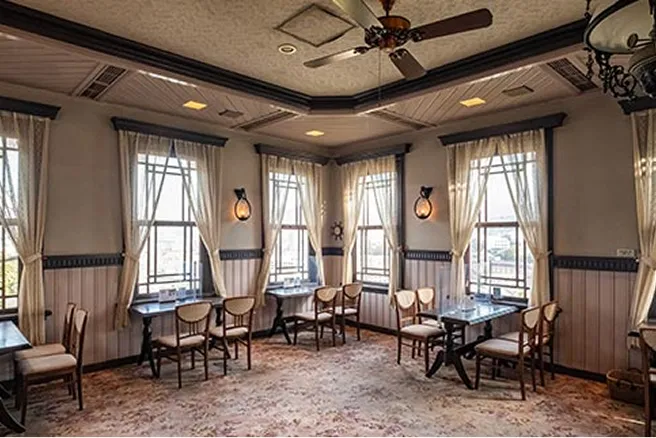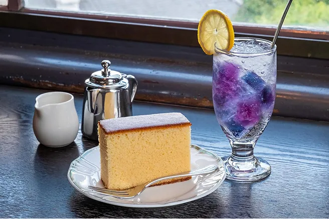 園内を歩き疲れたら、アンティークな調度品が心地よい喫茶室へ。まるで明治時代に訪れたかのような気分に。おすすめはキラキラとしたゼリーが輝く「長崎カステラ&紫陽花ゼリーソーダ(1,200円)」。