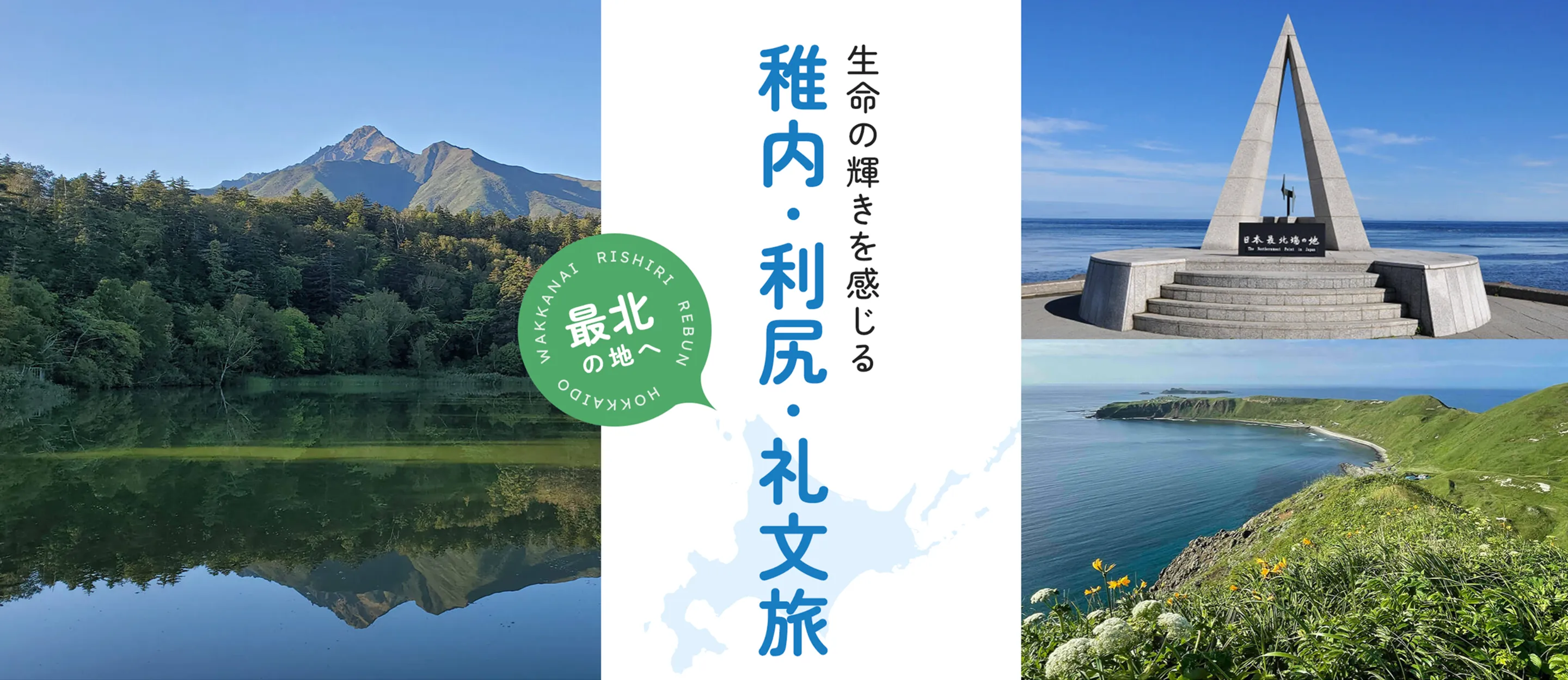 一周約60kmある円形島の中央には、日本百名山のひとつである標高1721mの利尻山がそびえ立ちます。過酷な自然環境がもたらしたのは、極上の海の幸や圧倒的な自然の造形美。利尻富士町と利尻町のふたつの街をぐるりとめぐりましょう。