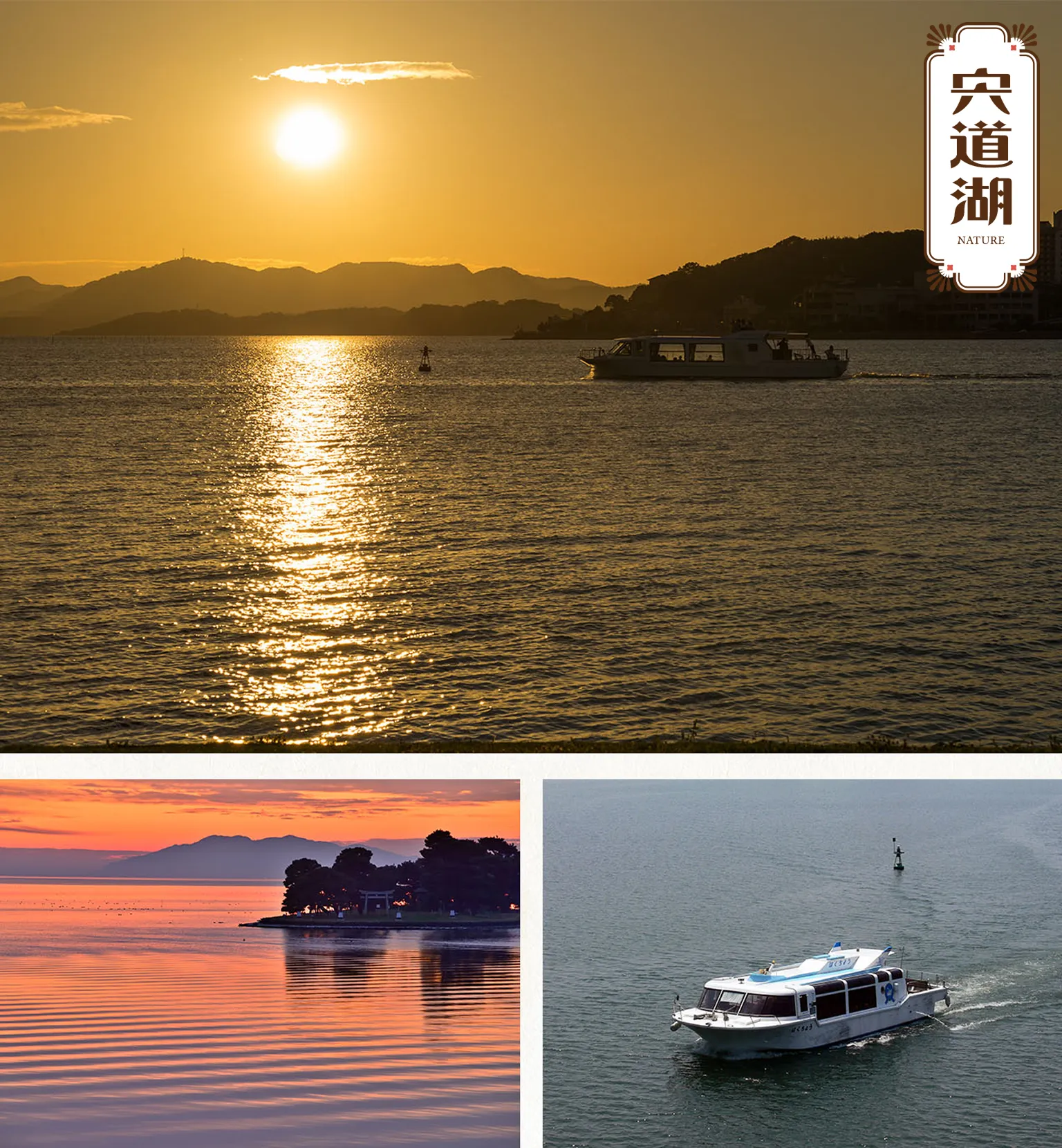 宍道湖は松江の街を抱く汽水湖で、古くから物流や食など街の歴史を支えてきました。八雲とセツも愛したとされる季節や時間によって様々な色彩に変化する夕景は「日本の夕陽百選」に選ばれています。遊覧船「はくちょう号」へ乗れば、夕日に包まれたかのようなクルーズが楽しめます。