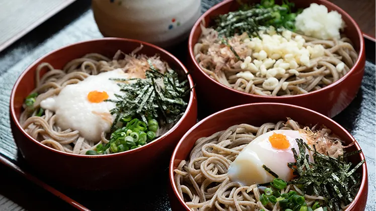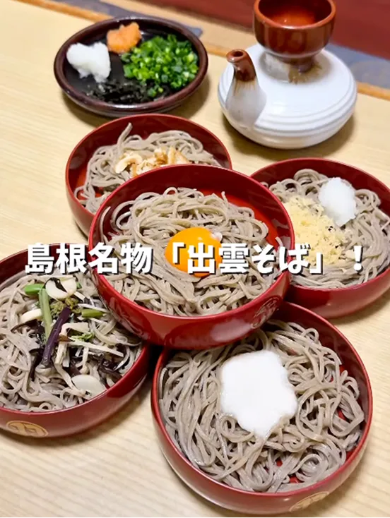 出雲そば文化の代表三段重ねの器に盛られた割子そば。江戸時代に、野外でそばを食べるため、重箱に入れて持ち運んでいたのが始まりと言われています。まずは一番上の段に薬味とつゆを加え、食べ終わったらさらに残ったつゆや薬味を次の段に回しかけていきます。
