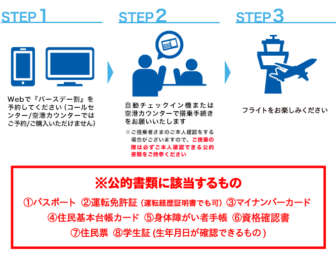 | 利用条件 | 下記の条件を満たしたうえで、予約/販売開始日からご搭乗日前日までに、『バースデー割』運賃でご予約/ご購入いただいた場合に適用されます ※FDAコールセンター/空港カウンターではご予約/ご購入いただけません ※販売座席数には限りがあり、一部の期間/路線/便によっては設定がない場合があります ■ご搭乗日がお誕生月のお客様ご本人および同行者5名までご利用いただけます ※対象のお客様お一人でもご利用いただけます ※ご同行者様の追加はご予約時、またはお支払い前に予約照会画面から予約詳細画面にてお願いします ■ご搭乗手続きの際、誕生日を証明する公的書類をご提示いただく場合がございます ※公的書類をご提示いただけない場合は、『バースデー割』でご搭乗いただけません ■お誕生月のお客様ご本人がご搭乗を取り消した場合、同行者のみではご利用いただけません ■『バースデー割』のご利用回数に制限はございません |