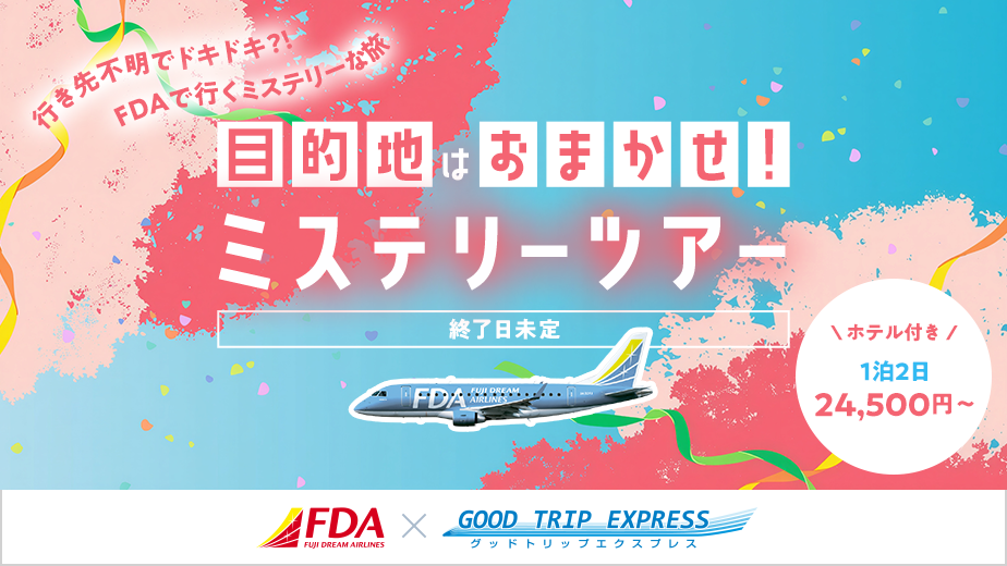 静岡、名古屋、神戸、福岡、札幌、松本の6つのエリアから出発地を選び、目的地はおまかせ!FDAの就航がある"どこかの空港"に到着します。行きたいところ、初めて行く場所…行き先が発表されるまでも楽しめる、ドキドキなプランです。