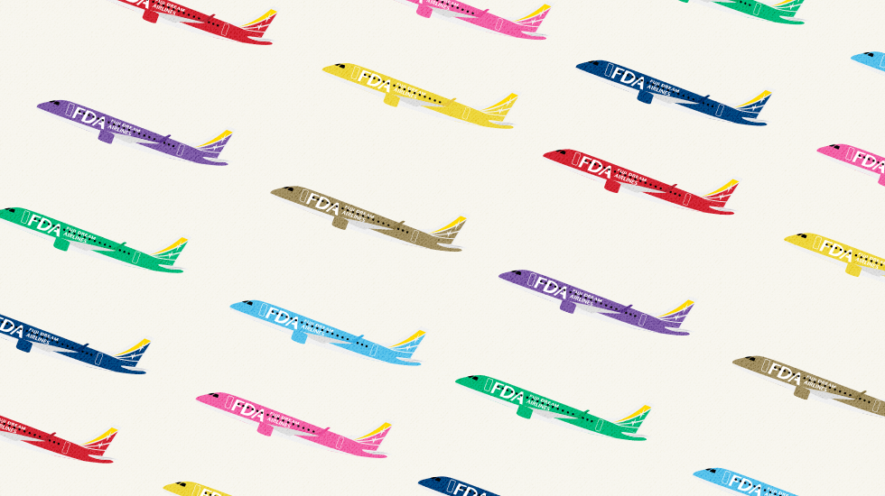 FDAが運航する飛行機は、1機ごとに色が異なる「マルチカラーコンセプト」を採用しています。これには各地方がそれぞれ固有の文化を維持しながら、独自の色で輝いてほしい。そんな魅力ある地方同士を結ぶ翼となって、彩り豊かな日本をつくりたいという想いが込められています。